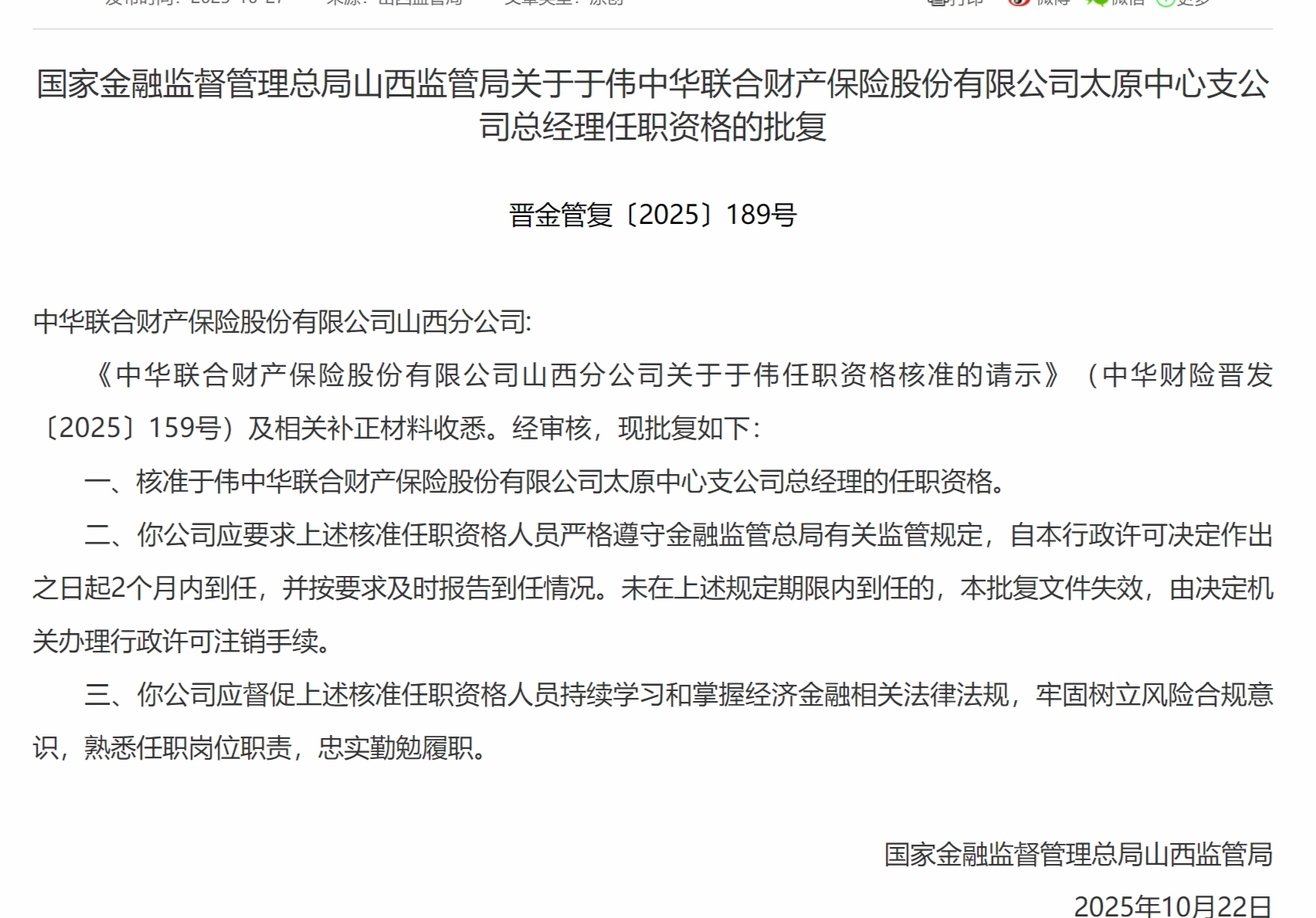 10月27日,国家金融监督管理总局山西监管局发布关于于伟中华联合财产保险股份有限公司太原中心支公司总经理任职资格的批复,核准于伟中华联合财产保险股份有限公司太原中心支公司总经理的任职资格。
